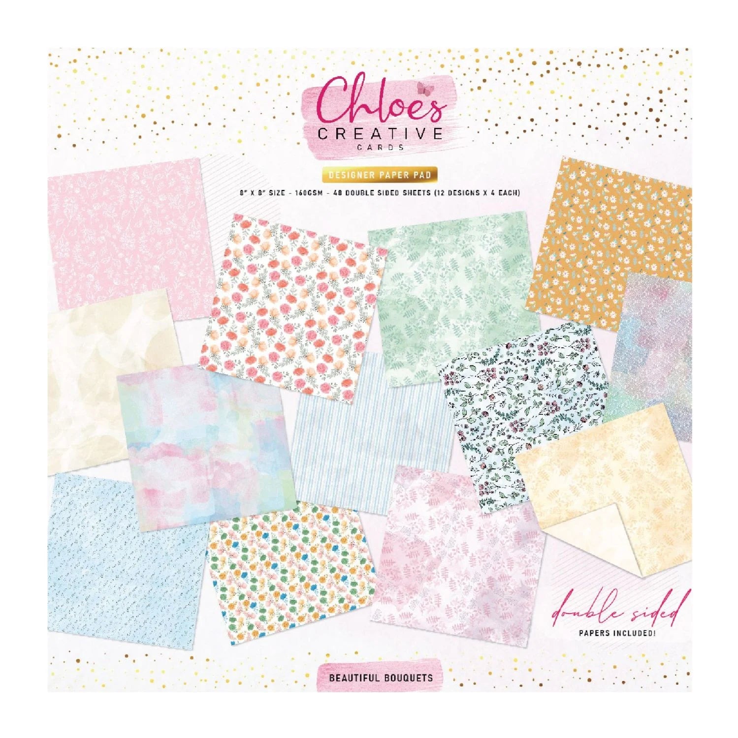 DESIGNED AS PART OF THE FABULOUSLY FLORAL 'BUILD A BOUQUET' COLLECTION BUT EQUALLY PERFECT USED STANDALONE, THIS BEAUTIFUL BOUQUETS 8" X 8" DESIGNER PRINTED PAPER PAD CONTAINS 48 SHEETS OF HIGH QUALITY 160GSM DOUBLE SIDED DESIGNS