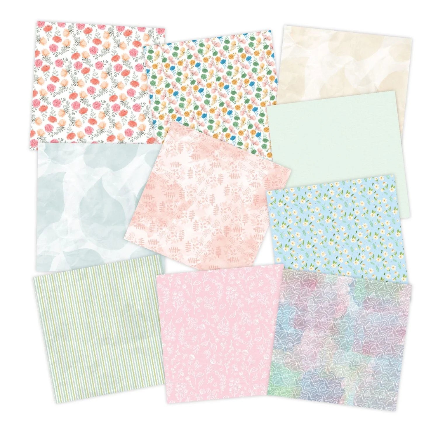 THERE ARE 24 DESIGNS IN TOTAL (2 OF EACH OF THE 24 DOUBLE SIDED SHEETS) AND THEY INCLUDE DITSY FLORAL PRINTS, STRIPES, WATERCOLOUR WASHES, GEOMETRIC DESIGNS AND LEAF IMAGES IN BOTH SOFT, PASTEL HUES AND BRIGHTER COLOURWAYS
