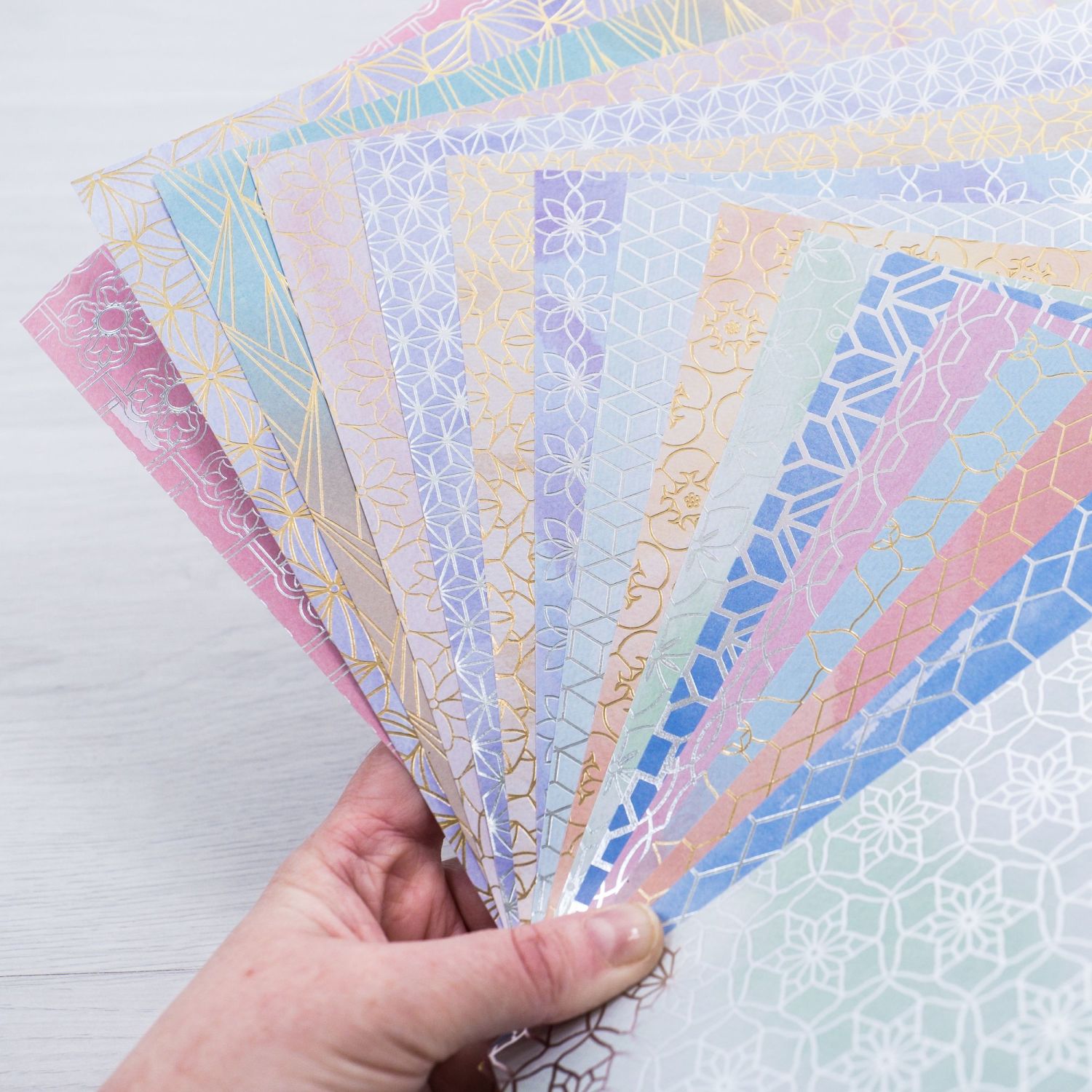 WITH A GEOMETRIC EVERYDAY THEME THIS PAPER PAD INCLUDES BEAUTIFUL PASTEL WATERCOLOUR SHADES OF BLUE, PURPLE, PEACH, PINK, GREEN, YELLOW AND ORANGE WHICH HAVE BEEN LUXURIOUSLY FOILED WITH GEOMETRIC PATTERNS IN GOLD AND SILVER
