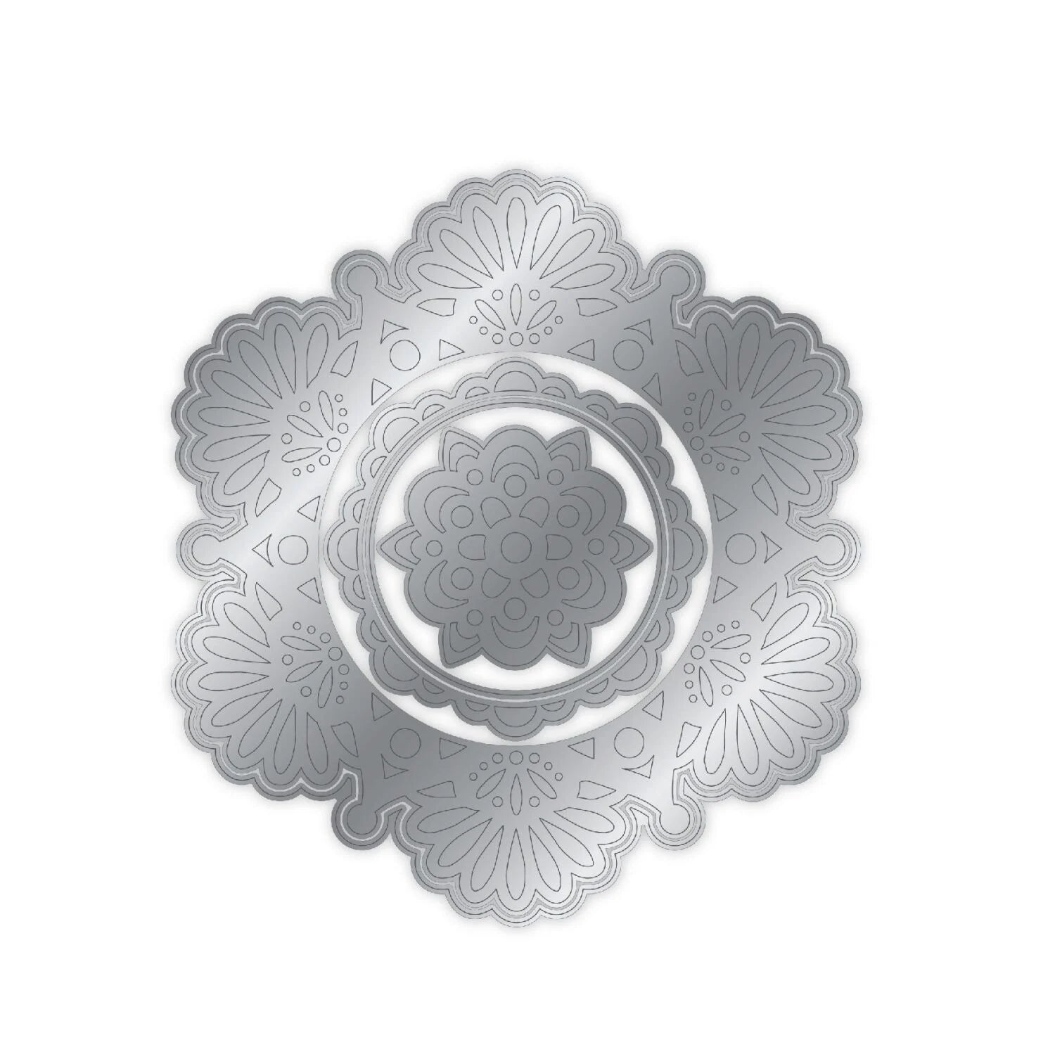CONTAINING 5 INDIVIDUAL METAL DIES THAT ALLOW YOU TO CUT IN OR CUT OUT, AND TO LAYER FOR FABULOUS, DIMENSIONAL RESULTS, YOU CAN HAVE SO MUCH FUN PLAYING WITH THIS MANDALA OF BEAUTY DIE SET