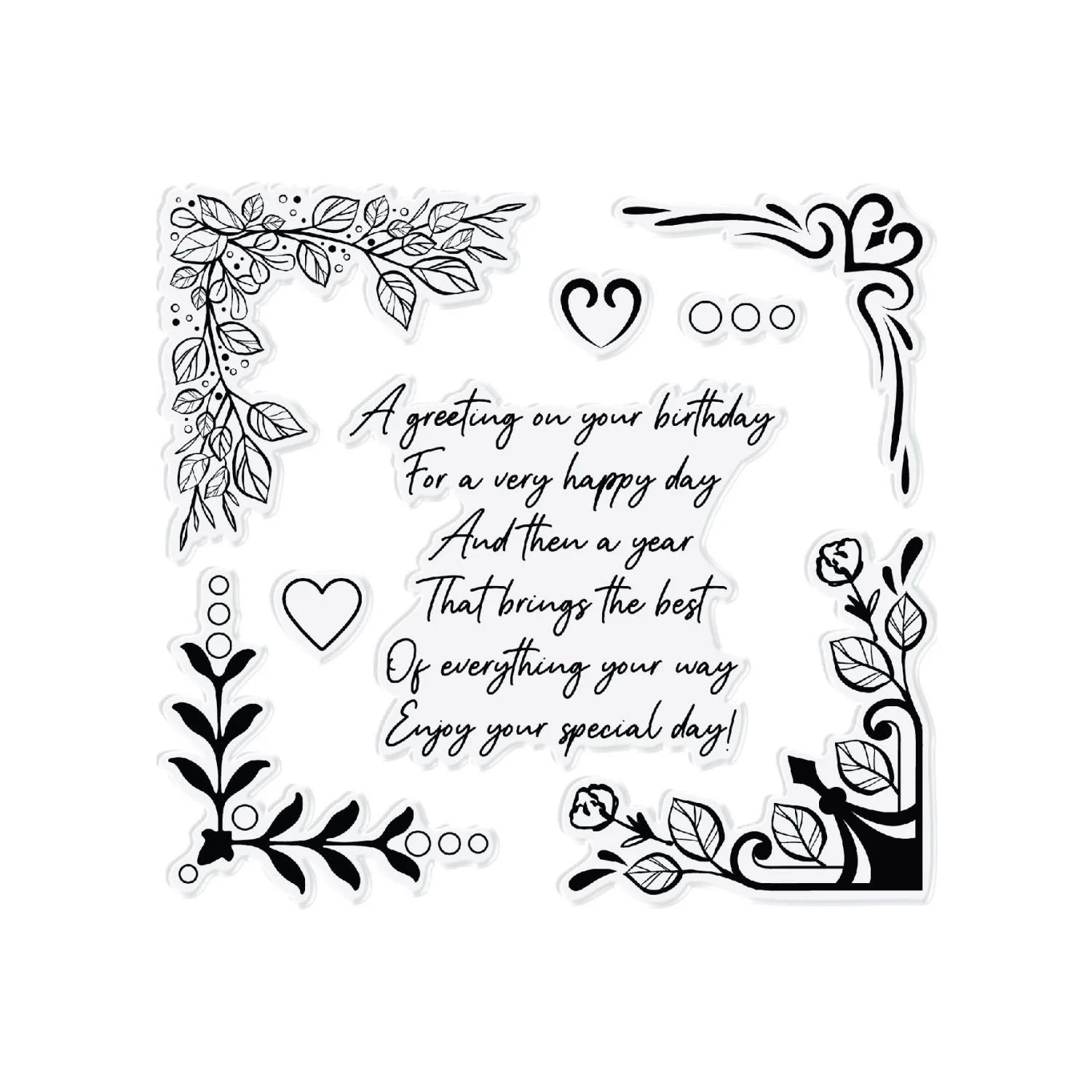 THERE ARE EIGHT STAMPS IN TOTAL IN THIS SET: FOUR ELABORATE CORNERS (THAT HAVE BEEN DESIGNED SO THAT YOU CAN ROTATE EACH ONE TO BUILD UP A COMPLETE FRAME), A BIRTHDAY POEM IN A LOVELY SCRIPTY FONT AND THREE EMBELLISHMENT DESIGNS
