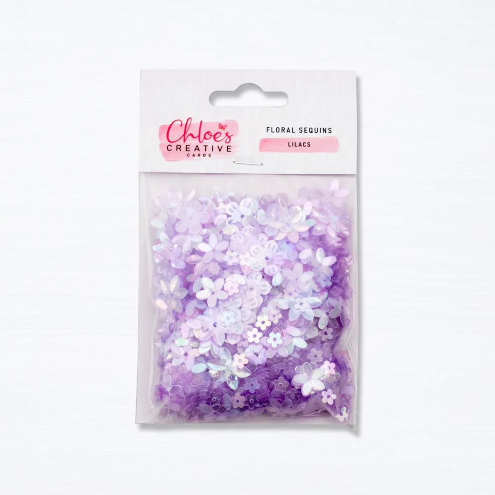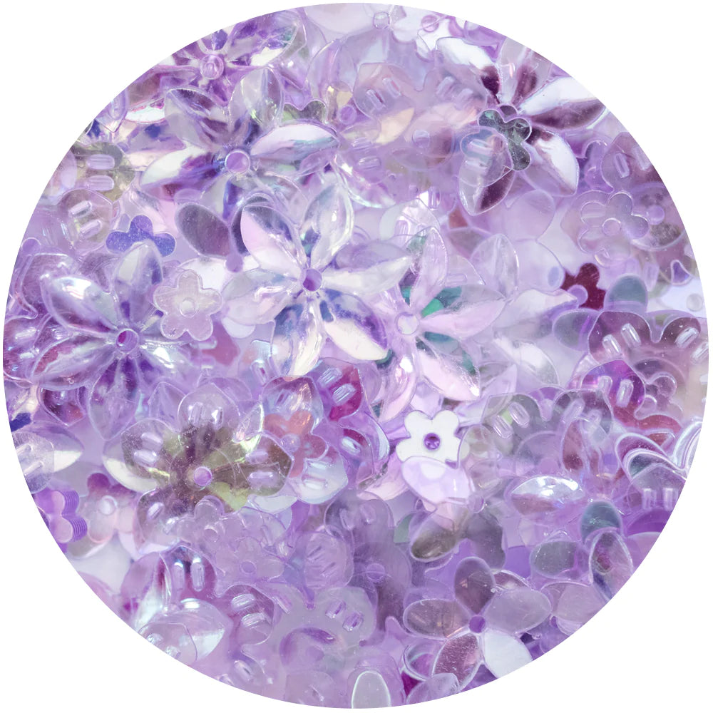 THIS JAM PACKED BAG OF LILAC FLORAL SEQUINS IN MIXED SIZES IS PERFECT FOR ADDING PRETTY, FLOWER SHAPED EMBELLISHMENTS TO YOUR CARDS, SCRAPBOOKING LAYOUT, GIFT TAGS OR ANY OTHER PAPERCRAFT PROJECTS