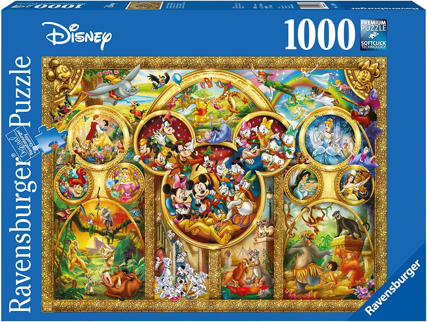SHOWING A BUSY AND COLOURFUL DISNEY GALLERY OF CHARACTERS THIS HIGH QUALITY 1000 PIECE JIGSAW PUZZLE IS MADE FROM STRONG PREMIUM GRADE CARDBOARD WITH A LINEN FINISH PRINT TO MINIMISE GLARE ON PUZZLE IMAGE